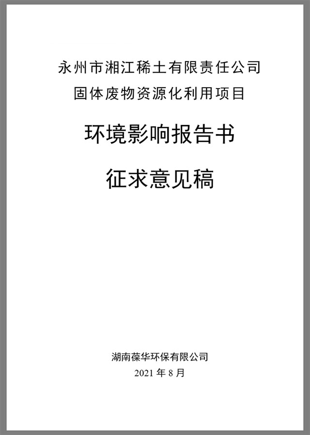 永州市湘江稀土有限責(zé)任公司固體廢物資源化利用項(xiàng)目 環(huán)境影響評(píng)價(jià)信息公示